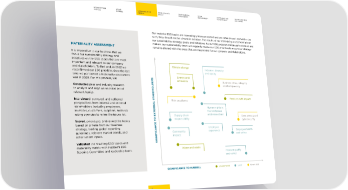 MESSAGE FROM ABOUT SUSTAINABILITY AT PRODUCTS WITH ENVIRONMENTAL SOCIAL GOVERNANCE AND GRI, SASB, AND TCFD OUR CEO HUBBELL HUBBELL IMPACT STEWARDSHIP RESPONSIBILITY ACCOUNTABILITY DISCLOSURES Our material ESG topics are increasingly interconnected and can often impact each other. As such, they should not be viewed in isolation. The results of our materiality assessment inform our sustainability strategy, goals, and initiatives. As our ESG program continues to develop and HUBBELL MATERIALITY MATRIX (TOP 14 TOPICS) mature, our sustainability team will regularly review our ESG priorities to ensure our strategy The following 14 topics resulted from the 2023 Materiality Assessment. MATERIALITY ASSESSMENT remains aligned with the areas that are meaningful for our company and stakeholders. It is imperative to our business that we focus our sustainability strategy and initiatives on the ESG topics that are most important and relevant to our company Climate change and stakeholders. To that end, in 2022 we Inclusion, diversity, recon昀椀rmed our ESG priorities since the last and equity time we performed a materiality assessment Energy and was in 2020. For this process, we: emissions Business ethics, integrity, Conducted peer and industry research and transparency to analyze and align on an initial list of relevant topics. AKEHOLDERS Interviewed, surveyed, and gathered T Products with Impact Risk excellence perspectives from internal and external stakeholders, including employees, Human rights in investors, customers, suppliers, and ESG the workplace rating agencies to re昀椀ne the issues list. Supply chain and value chain Data privacy and Scored, prioritized, and ranked the topics O EXTERNAL S responsibility cybersecurity based on criteria from our business strategy, leading global reporting Employee guidelines, relevant market trends, and Community experience Employee health other salient inputs. impact and safety Validated the resulting ESG topics and SIGNIFICANCE T materiality matrix with Hubbell’s ESG Steering Committee and leadership team. Water and waste Product quality and safety SIGNIFICANCE TO HUBBELL Environmental Social Governance 10