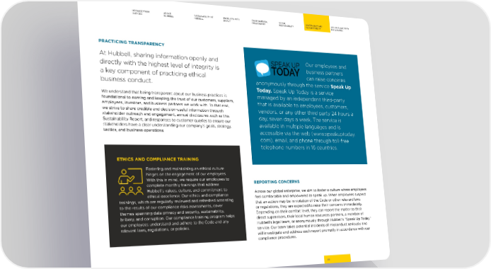 MESSAGE FROM ABOUT SUSTAINABILITY AT PRODUCTS WITH ENVIRONMENTAL SOCIAL GOVERNANCE AND GRI, SASB, AND TCFD OUR CEO HUBBELL HUBBELL IMPACT STEWARDSHIP RESPONSIBILITY ACCOUNTABILITY DISCLOSURES PRACTICING TRANSPARENCY At Hubbell, sharing information openly and Our employees and directly with the highest level of integrity is business partners a key component of practicing ethical can raise concerns business conduct. anonymously through the service Speak Up Today. Speak Up Today is a service We understand that being transparent about our business practices is managed by an independent third-party foundational to earning and keeping the trust of our customers, suppliers, that is available to employees, customers, employees, investors, and business partners we work with. To that end, we strive to share credible and decision-useful information through vendors, or any other third party 24 hours a stakeholder outreach and engagement, annual disclosures such as this day, seven days a week. The service is Sustainability Report, and responses to customer queries to ensure our available in multiple languages and is stakeholders have a clear understanding our company’s goals, strategy, tactics, and business operations. accessible via the web (www.speakuptoday. com), email, and phone through toll-free telephone numbers in 16 countries. ETHICS AND COMPLIANCE TRAINING Fostering and maintaining an ethical culture hinges on the engagement of our employees. With this in mind, we require our employees to REPORTING CONCERNS complete monthly trainings that address Hubbell’s values, culture, and commitment to Across our global enterprise, we aim to foster a culture where employees ethical excellence. Our ethics and compliance feel comfortable and empowered to speak up. When employees suspect trainings, which are regularly reviewed and refreshed according that an action may be in violation of the Code or other relevant laws to the results of our compliance risks assessments, cover or regulations, they are expected to raise their concerns immediately. themes spanning data privacy and security, sustainability, Depending on their comfort level, they can report the matter to their bribery, and corruption. Our compliance training program helps direct supervisors, their local human resources partners, a member of our employees understand and adhere to the Code and any Hubbell’s legal team, or anonymously through Hubbell’s “Speak Up Today” relevant laws, regulations, or policies. service. Our team takes potential incidents of misconduct seriously and will investigate and address each report promptly in accordance with our compliance procedures. 59