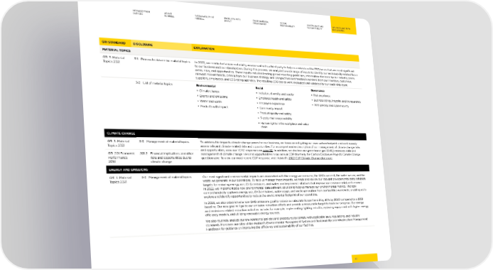 MESSAGE FROM ABOUT SUSTAINABILITY AT PRODUCTS WITH ENVIRONMENTAL SOCIAL GOVERNANCE AND GRI, SASB, AND TCFD OUR CEO HUBBELL HUBBELL IMPACT STEWARDSHIP RESPONSIBILITY ACCOUNTABILITY DISCLOSURES GRI STANDARD DISCLOSURE EXPLANATION MATERIAL TOPICS GRI 3: Material 3-1 Process to determine material topics In 2022, we conducted a new materiality assessment with a third party to help us understand the ESG issues that are most signi昀椀cant Topics 2021 to our business and our stakeholders. During this process, we analyzed a wide range of inputs to identify our sustainability-related focus areas, risks, and opportunities. These inputs included leading global reporting guidelines, information disclosed by our industry peers, relevant market trends, criteria from our business strategy, and perspectives and feedback received from our investors, customers, suppliers, employees, and ESG rating agencies. The resulting ESG topics were evaluated and validated by our leadership team. 3-2 List of material topics Environmental Social Governance • Climate change • Inclusion, diversity, and equity • Risk excellence • Energy and emissions • Employee health and safety • Business ethics, integrity, and transparency • Water and waste • Employee experience • Data privacy and cybersecurity • Products with Impact • Community impact • Product quality and safety • Supply chain responsibility • Human rights in the workplace and value chain CLIMATE CHANGE GRI 3: Material 3-3 Management of material topics To address the impacts climate change poses for our business, we focus on mitigating our own carbon footprint and continuously Topics 2021 assess relevant climate-related risks and opportunities. For a comprehensive description of our management of climate change risks and opportunities, view our TCFD responses on page 82. In addition, we disclose our greenhouse gas (GHG) emissions data and GRI 201 Economic 201-2 Financial implications and other management of climate change risks and opportunities in our annual CDP (formerly the Carbon Disclosure Project) Climate Change Performance risks and opportunities due to questionnaire. To view our most recent CDP response, visit Hubbell’s 2022 CDP Climate Change disclosure. 2016 climate change ENERGY AND EMISSIONS GRI 3: Material 3-3 Management of material topics Our most signi昀椀cant environmental impacts are associated with the energy we consume, the GHGs we emit, the water we use, and the Topics 2021 waste we generate in our operations. To help us manage these impacts, we track and review our relevant environmental data; establish targets for reducing energy use, GHG emissions, and water; and implement initiatives that improve our environmental performance. In 2022, we implemented a new environmental data software solution to help us manage our environmental metrics. This tool comprehensively captures energy use, GHG emissions, water usage, and waste generation from our facilities worldwide, enabling us to explore and identify opportunities to reduce the environmental footprint of our operations. In 2023, we also established a new GHG emissions goal to reduce our absolute Scope 1 and 2 by 30% by 2030 compared to a 2021 baseline. Our new goal will guide our emission reduction e昀昀orts and provide a measurable target to track our progress. Our energy and emissions related reduction activities include, for example, implementing lighting retro昀椀ts, replacing equipment with higher energy e昀케ciency models, and utilizing renewable energy sources. We also routinely analyze our environmental policies and procedures to comply with applicable laws, regulations, and industry standards. Moreover, our sites utilize Hubbell’s Environmental Management System and Sustainability and Infrastructure Management Handbook for guidance on improving the e昀케ciency and sustainability of our facilities. 67