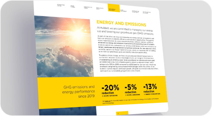 MESSAGE FROM ABOUT SUSTAINABILITY AT PRODUCTS WITH ENVIRONMENTAL SOCIAL GOVERNANCE AND GRI, SASB, AND TCFD OUR CEO HUBBELL HUBBELL IMPACT STEWARDSHIP RESPONSIBILITY ACCOUNTABILITY DISCLOSURES ENERGY AND EMISSIONS At Hubbell, we are committed to managing our energy use and lowering our greenhouse gas (GHG) emissions. As part of that e昀昀ort, we focus on measuring our energy and fuel consumption and track our emissions to identify e昀케ciency and reduction opportunities. Through the recent implementation of a new environmental data software solution, in 2022 we enhanced our energy and emissions inventories by incorporating more of Hubbell’s locations and o昀케ces, compared to our previous 2021 dataset which was limited to our largest warehouses and manufacturing facilities worldwide. Our new data tool, which currently captures our Scope 1 and 2 emissions, serves an important role in enabling us to track our greenhouse gases and identify reduction opportunities. To address climate change, we focus on pursuing operational improvements in our facilities. However, to drive meaningful results, we recognize the importance of establishing an ambitious goal. Since we achieved our previous emissions goal, we established a new GHG emissions goal to reduce our absolute Scope 1 and 2 emissions by 30% by 2030 compared to a 2022 baseline. Our new goal, which was developed using leading science-based methodologies within the context of our business’ current impacts and future growth, will guide our emission reduction e昀昀orts and launch our sustainability program into a new chapter. GHG emissions and -20% -5% -13% energy performance reduction reduction reduction since 2019: IN SCOPE 1 EMISSIONS IN SCOPE 2 EMISSIONS IN ENERGY CONSUMPTION See page 26 for more information on our GHG emissions and energy consumption performance and methodology. 25