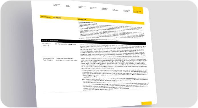 MESSAGE FROM ABOUT SUSTAINABILITY AT PRODUCTS WITH ENVIRONMENTAL SOCIAL GOVERNANCE AND GRI, SASB, AND TCFD OUR CEO HUBBELL HUBBELL IMPACT STEWARDSHIP RESPONSIBILITY ACCOUNTABILITY DISCLOSURES GRI STANDARD DISCLOSURE EXPLANATION Waste and Recycling Inventory Footnotes: 1. Hubbell r eports all waste and recycling from our wholly owned companies’ leased and owned manufacturing, warehouse, and o昀케ce facilities worldwide. The waste generated and recycled of consolidated joint operations are included pro rata, based on our 50% interest. Waste and recycling for select sites where Hubbell does not pay the service bill (i.e., primarily tenant-shared o昀케ce space) are excluded from the reported waste generated and recycled. Estimates are used where primary data is not available. Waste generated and waste recycled are reported in US tons (ton). 2. Hubbell es tablished a threshold for signi昀椀cance of 5% or greater in Hubbell’s total base-year waste and recycling for the company’s rebaseline policy. While our new environmental goals reference a 2022 baseline, we applied this policy to our 2019-2021 historical data to help us track Hubbell’s environmental reduction progress over time. In October 2021, Hubbell initiated the sale of its Commercial and Industrial Lighting business, which was completed in 2022. This divestment triggered our rebaseline policy and our stated historical data re昀氀ects this. In addition, Hubbell grew its business with acquisitions in the second half of 2022 - PCX Holdings LLC, Ripley Tools, and REF Automation. These acquisitions did not trigger our rebaseline policy for historical data, however these sites are included in our inventory for 2022 onward. 3. Hazardous waste data represents waste deemed hazardous by region-speci昀椀c de昀椀nitions. PRODUCTS WITH IMPACT GRI 3: Material 3-3 Management of material topics From ideation to production, we are committed to developing best-in-class products that meet our customers’ business and sustainability Topics 2021 objectives. Hubbell’s New Product Development (NPD) e昀昀orts are centered on developing solutions that enable our customers to solve critical infrastructure problems. In addition to continuing to pursue NPD innovations in our existing product lines, Hubbell has recently accelerated our e昀昀orts to invest in higher value innovation opportunities across our portfolio. These investments are primarily focused in six key strategic growth verticals: utility transmission and distribution (T&D) infrastructure, utility distribution automation, electrical transportation, renewables, data centers, and communications. Increasing our NPD investment in these verticals supports our strategy to accelerate organic growth across clean energy megatrends in grid modernization and electri昀椀cation. In addition, our NPD e昀昀orts are conducted through a comprehensive stage-gate process, which includes a stage evaluating environmental performance. No applicable GRI Custom disclosure: Total sales Hubbell’s Products with Impact support the transition to an energy e昀케cient and low-carbon economy through four impact categories: grid Topic Standard associated with Products with Impact modernization and hardening, resource e昀케ciency, renewable energy, and electri昀椀cation. Our Products with Impact represented approximately 63% of our total sales in 2022. This calculation includes all sales from electrical utility T&D components and utility communications and controls, as well as products sold directly into solar and wind applications. It also includes products that support grid modernization and communications applications such as 5G/昀椀ber/broadband access and data centers. This calculation excludes sales from products sold into oil and gas markets, which enhance the safety of those applications. It also excludes sales from our broader portfolio of electrical products sold into various industrial, non-residential, and residential applications. • HUS enables the grid t o conduct, communicate, and control energy across utility applications. Our critical utility T&D components harden critical infrastructure, enabling the grid to reliably transmit and distribute energy. In addition, HUS' utility communications and controls technologies provide data collection, analysis, and control capabilities that enable the management of energy T&D with consumption. By making the grid smarter and more 昀氀exible, our communications and controls solutions facilitate the integration of renewables and the electri昀椀cation of everything. • HES pr ovides critical components that allow operators of buildings, factories, and other industrial infrastructure to connect, protect, wire, and manage power reliably and e昀케ciently. HES solutions increase the energy e昀케ciency of buildings and infrastructure, as well as support electri昀椀cation of sectors including transportation and manufacturing. Moreover, while our decarbonization-related products are salient to our business and our industry, we believe that our solutions also generate positive social and environmental impacts beyond our Products with Impact categories. These bene昀椀ts include enhancing safety, resource e昀케ciency, hardening of infrastructure, explosion prevention, and rural broadband access. For example, Hubbell Gas Utility Solutions o昀昀ers connectors and valves that both promote resource e昀케ciency and prevent gas leaks and spills. 71