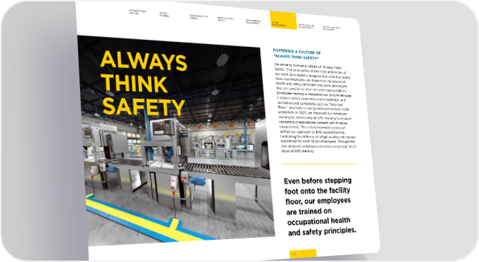 MESSAGE FROM ABOUT SUSTAINABILITY AT PRODUCTS WITH ENVIRONMENTAL SOCIAL GOVERNANCE AND GRI, SASB, AND TCFD OUR CEO HUBBELL HUBBELL IMPACT STEWARDSHIP RESPONSIBILITY ACCOUNTABILITY DISCLOSURES FOSTERING A CULTURE OF “ALWAYS THINK SAFETY” We strive to nurture a culture of “Always Think Safety” that puts safety at the front and center of ALWAYS our work. Even before stepping foot onto the facility 昀氀oor, our employees are trained on occupational health and safety principles and work procedures that are speci昀椀c to their role and responsibilities. THINK Employee training is integral to our culture because it fosters safety awareness and knowledge, and our behavioral campaigns, such as “Stop and Think,” also hone a safety-oriented mindset in the SAFETY workplace. In 2022, we improved our employee training by formalizing an EHS Training Curriculum consisting of educational content with timeline requirements. This enterprise-wide curriculum uni昀椀ed our approach to EHS-related training, facilitating the delivery of a high-quality educational experience for each of our employees. Through this new program, employees received an average of 2.5 hours of EHS training. Even before stepping foot onto the facility 昀氀oor, our employees are trained on occupational health and safety principles. 44