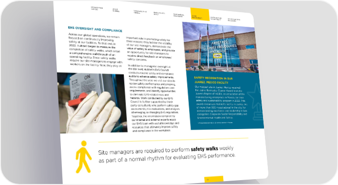 MESSAGE FROM ABOUT SUSTAINABILITY AT PRODUCTS WITH ENVIRONMENTAL SOCIAL GOVERNANCE AND GRI, SASB, AND TCFD OUR CEO HUBBELL HUBBELL IMPACT STEWARDSHIP RESPONSIBILITY ACCOUNTABILITY DISCLOSURES EHS OVERSIGHT AND COMPLIANCE Across our global operations, we remain important role in promoting safety for focused on continuously improving three reasons: they bolster the visibility safety at our facilities. To that end, in of our site managers, demonstrate the 2022, Hubbell began to measure the value of safety to employees, and provide completion of safety walks, which entail an opportunity for site managers to a comprehensive walkthrough of an receive direct feedback on employees' operating facility. Since safety walks safety concerns. require our site managers to engage with workers on the facility 昀氀oor, they play an In addition to managerial oversight at the site level, Hubbell’s EHS Council conducts routine safety and compliance audits to advance safety improvements. SAFETY RECOGNITION IN OUR Throughout the year, we visit our sites to JUAREZ, MEXICO FACILITY review safety performance and progress, Our Hubbell site in Juarez, Mexico received assess compliance with regulations and the Jaime Bermudez Cuaron Award from the requirements, and identify opportunities Juarez chapter of INDEX, an association of the to eliminate EHS-related risks and manufacturing enterprises in Mexico, for their hazards. Work conducted by our EHS safety and sustainability program in 2022. This Council is further supported by third- award recognizes Hubbell’s facility in Juarez, out party consultants who perform safety gap 1 assessments, risk evaluations, and analyses of more than 300 maquiladoras in the city, for of emerging or changing EHS regulations. demonstrating excellence and leadership in two Together, the information compiled by categories: Corporate Social Responsibility and our internal and external experts equip Environmental Health and Safety. our EHS team with useful knowledge and 1. Maquiladora denotes a US factory located in Mexico. resources that ultimately improve safety and compliance in the workplace. Site managers are required to perform safety walks weekly as part of a normal rhythm for evaluating EHS performance. 45