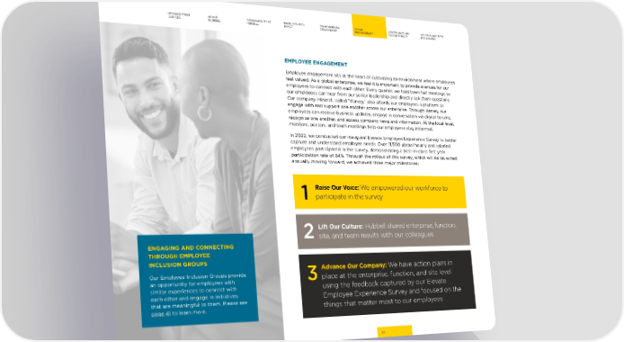 MESSAGE FROM ABOUT SUSTAINABILITY AT PRODUCTS WITH ENVIRONMENTAL SOCIAL GOVERNANCE AND GRI, SASB, AND TCFD OUR CEO HUBBELL HUBBELL IMPACT STEWARDSHIP RESPONSIBILITY ACCOUNTABILITY DISCLOSURES EMPLOYEE ENGAGEMENT Employee engagement sits at the heart of cultivating an environment where employees feel valued. As a global enterprise, we feel it is important to provide avenues for our employees to connect with each other. Every quarter, we hold town hall meetings so our employees can hear from our senior leadership and directly ask them questions. Our company intranet, called “Harvey,” also a昀昀ords our employees a platform to engage with and support one another across our enterprise. Through Harvey, our employees can receive business updates, engage in conversation via digital forums, recognize one another, and access company news and information. At the local level, monitors, posters, and team meetings help our employees stay informed. In 2022, we conducted our inaugural Elevate Employee Experience Survey to better capture and understand employee needs. Over 11,500 global hourly and salaried employees participated in the survey, demonstrating a best-in-class 昀椀rst year participation rate of 84%. Through the rollout of this survey, which will be launched annually moving forward, we achieved three major milestones: Raise Our Voice: We empowered our workforce to 1 participate in the survey 2Lift Our Culture: Hubbell shared enterprise, function, site, and team results with our colleagues ENGAGING AND CONNECTING THROUGH EMPLOYEE INCLUSION GROUPS Advance Our Company: We have action plans in Our Employee Inclusion Groups provide 3place at the enterprise, function, and site level an opportunity for employees with similar experiences to connect with using the feedback captured by our Elevate each other and engage in initiatives Employee Experience Survey and focused on the that are meaningful to them. Please see things that matter most to our employees page 41 to learn more. 35