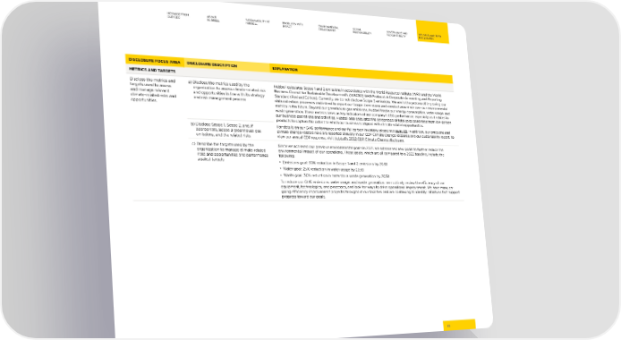 MESSAGE FROM ABOUT SUSTAINABILITY AT PRODUCTS WITH ENVIRONMENTAL SOCIAL GOVERNANCE AND GRI, SASB, AND TCFD OUR CEO HUBBELL HUBBELL IMPACT STEWARDSHIP RESPONSIBILITY ACCOUNTABILITY DISCLOSURES DISCLOSURE FOCUS AREA DISCLOSURE DESCRIPTION EXPLANATION METRICS AND TARGETS Disclose the metrics and a) Disclose the metrics used by the Hubbell calculates Scope 1 and 2 emissions in accordance with the World Resource Institute (WRI) and the World targets used to assess organization to assess climate-related risk Business Council for Sustainable Development’s (WBCSD) GHG Protocol: A Corporate Accounting and Reporting and manage relevant and opportunities in line with its strategy Standard (Revised Edition). Currently, we do not disclose Scope 3 emissions. We are in the process of improving our climate-related risks and and risk management process data collection processes and intend to report our Scope 3 emissions and conduct assurance over our environmental opportunities. metrics in the future. Beyond our greenhouse gas emissions, Hubbell tracks our energy consumption, water usage, and waste generation. These metrics serve as key indicators of our company’s ESG performance, especially as it relates to our business operations and activities. Hubbell also calculates the percentage of total sales generated from low-carbon products to capture the extent to which our business is aligned with climate-related opportunities. b) Disclose Scope 1, Scope 2, and, if For details on our GHG performance and our full carbon inventory, please see page 68. In addition, our emissions and appropriate, Scope 3 greenhouse gas climate change-related risks are reported annually in our CDP Climate Change response and our sustainability report. To emissions, and the related risks view our annual CDP response, visit Hubbell’s 2022 CDP Climate Change disclosure. c) Describe the targets used by the Since we achieved our previous environmental goals in 2021, we established new goals to further reduce the organization to manage climate-related environmental impact of our operations. These goals, which are all compared to a 2022 baseline, include the risks and opportunities and performance following: against targets • Emissions goal: 30% reduction in Scope 1 and 2 emissions by 2030 • Water goal: 25% reduction in water usage by 2030 • Waste goal: 30% reduction in hazardous waste generation by 2030 To reduce our GHG emissions, water usage, and waste generation, we routinely review the e昀케ciency of our equipment, technologies, and processes, and look for ways to drive operational improvement. We have many on- going e昀케ciency improvement projects throughout our facilities and are continuing to identify initiatives that support progress toward our goals. 85