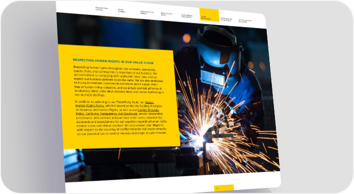 MESSAGE FROM ABOUT SUSTAINABILITY AT PRODUCTS WITH ENVIRONMENTAL SOCIAL GOVERNANCE AND GRI, SASB, AND TCFD OUR CEO HUBBELL HUBBELL IMPACT STEWARDSHIP RESPONSIBILITY ACCOUNTABILITY DISCLOSURES RESPECTING HUMAN RIGHTS IN OUR VALUE CHAIN Respecting human rights throughout our company, operations, supply chain, and communities is important to our business. We are committed to complying with applicable labor laws, and we expect our business partners to do the same. We are also dedicated to trying to maintain commercial operations and a supply chain free of human rights violations, and we strictly prohibit all forms of involuntary labor, child labor, bonded labor, and human tra昀케cking in our business dealings. In addition to adhering to our Third-Party Code, our Global Human Rights Policy, which is based on the UN Guiding Principles on Business and Human Rights, as well as our Con昀氀ict Minerals Policy, California Transparency Act Disclosure, vendor onboarding procedures, and contract and purchase order terms, establish the standards and expectations for our suppliers regarding human rights- related issues and ethical conduct. We also conduct due diligence with respect to the sourcing of con昀氀ict minerals and report annually on our potential use of con昀氀ict minerals and origin of such minerals. 52
