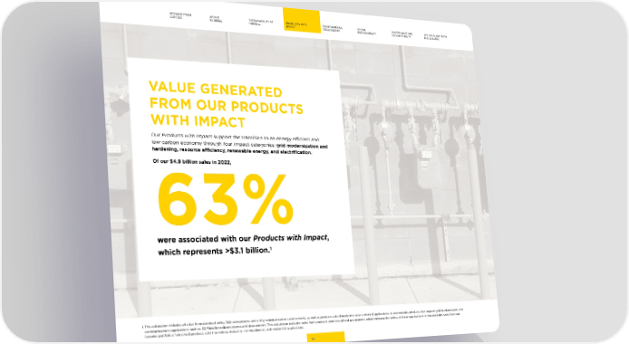 MESSAGE FROM ABOUT SUSTAINABILITY AT PRODUCTS WITH ENVIRONMENTAL SOCIAL GOVERNANCE AND GRI, SASB, AND TCFD OUR CEO HUBBELL HUBBELL IMPACT STEWARDSHIP RESPONSIBILITY ACCOUNTABILITY DISCLOSURES VALUE GENERATED FROM OUR PRODUCTS WITH IMPACT Our Products with Impact support the transition to an energy e昀케cient and low-carbon economy through four impact categories: grid modernization and hardening, resource e昀케ciency, renewable energy, and electri昀椀cation. Of our $4.9 billion sales in 2022, 63% were associated with our Products with Impact, 1 which represents >$3.1 billion. 1. This calculation includes all sales from electrical utility T&D components and utility communications and controls, as well as products sold directly into solar and wind applications. It also includes products that support grid modernization and communications applications such as 5G/昀椀ber/broadband access and data centers. This calculation excludes sales from products sold into oil and gas markets, which enhance the safety of those applications. It also excludes sales from our broader portfolio of electrical products sold into various industrial, non-residential, and residential applications. 15