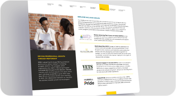 MESSAGE FROM ABOUT SUSTAINABILITY AT PRODUCTS WITH ENVIRONMENTAL SOCIAL GOVERNANCE AND GRI, SASB, AND TCFD OUR CEO HUBBELL HUBBELL IMPACT STEWARDSHIP RESPONSIBILITY ACCOUNTABILITY DISCLOSURES EMPLOYEE INCLUSION GROUPS Our Employee Inclusion Groups (EIGs) are a connection point for our colleagues who have similar life experiences to come together and share perspectives, engage in personal and professional development, participate in community service, and lead purpose-driven projects. Although each EIG has its own speci昀椀c mission, they all deliver our Inclusion Pillars and employee experience. We are proud of our EIGs and aim to support them as they pursue events, programs, and initiatives that promote a culture of inclusion and belonging. Women Advancing Their Careers at Hubbell (WATCH) strives to inspire the women of Hubbell to pursue their personal and professional goals, surpass their own expectations, and support WOMEN ADVANCING THEIR CAREERS AT HUBBELL other women within the network. MultiCultural Men (MCM) focuses on fostering appreciation for inclusion and multiculturalism while empowering men of color through training, mentoring, and networking opportunities that enhance personal development and leadership growth. For example, on June 19, 2022, MCM hosted virtual and on-site events DRIVING PROFESSIONAL GROWTH to celebrate Juneteenth and empower employees to be agents of change in the workplace. THROUGH MENTORSHIP 2022 marked the third year MCM and WATCH Veterans Engaged To Succeed (VETS) is open to all employees partnered to deliver Hubbell’s mentoring with previous military experience or employees who have a program, MATCH. This program, which connection to the military, such as military spouses or families. originated as the WATCH Mentoring Program VETS aims to create a supportive community, encourages but expanded through MCM’s network, matches advancement and personal growth, and pursues recruiting e昀昀orts mentees with mentors based on the areas where for individuals with similar experiences. each individual would like to grow. With more than 30 sets of mentor-mentee pairs matched in 2022, the collaboration between our two EIGs has sparked notable growth for the program. Hubbell Pride welcomes members and allies of the LGBTQ+ community. Hubbell Pride focuses on building enterprise-wide awareness of LGBTQ+ issues, promotes inclusion and diversity, and provides a safe space for employees, allies, and anyone seeking support. 41