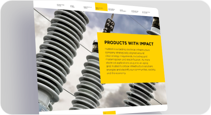 pcore image.pdf 1 12/19/22 1:12 PM MESSAGE FROM ABOUT SUSTAINABILITY AT PRODUCTS WITH ENVIRONMENTAL SOCIAL GOVERNANCE AND GRI, SASB, AND TCFD OUR CEO HUBBELL HUBBELL IMPACT STEWARDSHIP RESPONSIBILITY ACCOUNTABILITY DISCLOSURES C M Y CM MY CY PRODUCTS WITH IMPACT CMY K Hubbell is a leading electrical infrastructure company strategically aligned around clean energy megatrends, including grid modernization and electri昀椀cation. As more electrical applications plug into an aging grid, Hubbell’s critical infrastructure solutions energize and electrify our communities, society, and the economy. 13