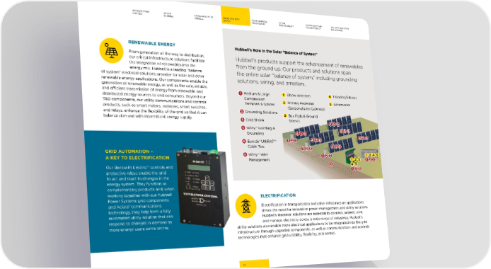 MESSAGE FROM ABOUT SUSTAINABILITY AT PRODUCTS WITH ENVIRONMENTAL SOCIAL GOVERNANCE AND GRI, SASB, AND TCFD OUR CEO HUBBELL HUBBELL IMPACT STEWARDSHIP RESPONSIBILITY ACCOUNTABILITY DISCLOSURES RENEWABLE ENERGY Hubbell’s Role in the Solar “Balance of System” From generation all the way to distribution, Hubbell’s products support the advancement of renewables our critical infrastructure solutions facilitate from the ground up. Our products and solutions span the integration of renewables into the energy mix. Hubbell is a leading “balance the entire solar “balance of system,” including grounding of system” electrical solutions provider for solar and other solutions, wiring, and arresters. renewable energy applications. Our components enable the generation of renewable energy, as well as the safe, reliable, and e昀케cient transmission of energy from renewable and 1 Medium & Large 1 Elbow Arresters 4 T-Bodies/Elbows distributed energy sources to end consumers. Beyond our Compression 2 Primary Pedestals 5 Accessories T&D components, our utility communications and controls Terminals & Splices (Sectionalizing Cabinets) products, such as smart meters, reclosers, smart switches, 2 Grounding Solutions and relays, enhance the 昀氀exibility of the grid so that it can 3 Box Pads & Ground balance demand with intermittent energy supply. 3 Cold Shrink Sleeves 4 5 6 4 Wiley™ Bonding & 4 5 6 Grounding 4 5 6 4 5 6 5 Burndy® UNIRAP™ 1 2 3 4 5 6 Cable Ties 1 2 3 4 5 6 GRID AUTOMATION – 6 Wiley™ Wire 1 2 3 1 2 4 5 A KEY TO ELECTRIFICATION Management 1 2 3 1 2 3 Our Beckwith Electric™ controls and 2 4 5 protective relays enable the grid 1 2 3 to act and react to changes in the energy system. They function as complementary products and, when working together with our Hubbell ELECTRIFICATION Power Systems grid components and Aclara® communications Electri昀椀cation in transportation and other infrastructure applications technology, they help form a fully drives the need for innovative power management and utility solutions. automated utility solution that can Hubbell’s electrical solutions are essential to connect, protect, wire, respond to changes in demand as and manage electricity across a wide range of industries. Hubbell’s more energy users come online. utility solutions also enable more electrical applications to be integrated into the grid infrastructure through upgraded components, as well as communications and controls technologies that enhance grid visibility, 昀氀exibility, and control. 19