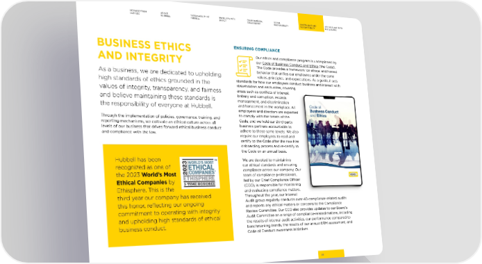 MESSAGE FROM ABOUT SUSTAINABILITY AT PRODUCTS WITH ENVIRONMENTAL SOCIAL GOVERNANCE AND GRI, SASB, AND TCFD OUR CEO HUBBELL HUBBELL IMPACT STEWARDSHIP RESPONSIBILITY ACCOUNTABILITY DISCLOSURES BUSINESS ETHICS ENSURING COMPLIANCE Our ethics and compliance program is underpinned by AND INTEGRITY our Code of Business Conduct and Ethics (the Code). The Code provides a framework for ethical and honest behavior that uni昀椀es our employees under the same As a business, we are dedicated to upholding values, principles, and expectations. As a guide, it sets high standards of ethics grounded in the standards for how our employees conduct business and interact with stakeholders and each other, covering values of integrity, transparency, and fairness areas such as con昀氀icts of interest, and believe maintaining these standards is bribery and corruption, records management, and discrimination the responsibility of everyone at Hubbell. and harassment in the workplace. All employees and directors are expected Through the implementation of policies, governance, training, and to comply with the tenets of the reporting mechanisms, we cultivate an ethical culture across all Code, and we hold our third-party levels of our business that drives forward ethical business conduct business partners accountable to and compliance with the law. adhere to these same tenets. We also require our employees to read and certify to the Code after the new hire onboarding process and re-certify to the Code on an annual basis. Hubbell has been We are devoted to maintaining recognized as one of our ethical standards and ensuring the 2023 World’s Most compliance across our company. Our team of compliance professionals, Ethical Companies by led by our Chief Compliance O昀케cer Ethisphere. This is the (CCO), is responsible for monitoring and evaluating compliance matters. third year our company has received Throughout the year, our Internal this honor, re昀氀ecting our ongoing Audit group regularly conducts over 40 compliance-related audits commitment to operating with integrity and reports any ethical matters or concerns to the Compliance Review Committee. Our CCO also provides updates to our Board’s and upholding high standards of ethical Audit Committee on a range of compliance-related matters, including business conduct. the results of internal audit activities, our performance compared to benchmarking trends, the results of our annual ERM assessment, and Code of Conduct awareness initiatives. 58