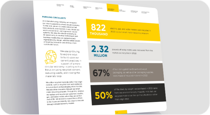 MESSAGE FROM ABOUT SUSTAINABILITY AT PRODUCTS WITH ENVIRONMENTAL SOCIAL GOVERNANCE AND GRI, SASB, AND TCFD OUR CEO HUBBELL HUBBELL IMPACT STEWARDSHIP RESPONSIBILITY ACCOUNTABILITY DISCLOSURES PURSUING CIRCULARITY As a manufacturing company, we recognize our role in supporting a more circular economy. electric, gas, and water meters were recycled in To that end, we aim to create solutions that 822 keep products and materials in use, design out 2022 via our smart meter recycling program waste and pollution, and regenerate natural THOUSAND systems. We view the circular economy as an opportunity to develop technologies and business models that are restorative and regenerative by design, with the added bene昀椀t of inspiring innovation and driving a more sustainable future. 2.32 pounds of scrap metal were recovered from the We are continuing meters we recycled in 2022 to explore ways MILLION to build upon our current practices in support of a more circular economy—starting with a focus on using recycled content, of our corrugated cardboard and wood reducing waste, and closing the 67% packaging, as well as other packaging supplies, materials loop. were made of recycled material in 2022 We utilize recycled materials rather than virgin content, such as recycled steel and cardboard, in our products and packaging where feasible. We also drive circularity through our smart of the steel, by weight, we purchased in 2022 came meter recycling program. Through this initiative, we replace and recycle our customers’ electric, from less environmentally impactful mills that use gas, and water meters when they are at their recycled material as their primary feedstock rather end of life. We intend to expand these e昀昀orts 50% in the future and identify new ways to innovate than virgin steel through circular economy models. 32