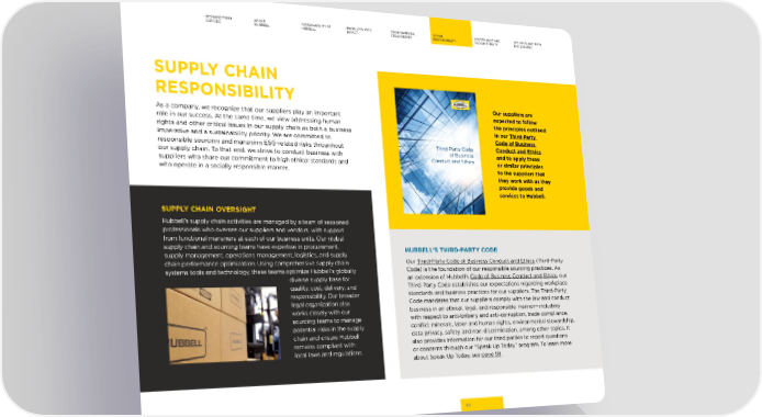 MESSAGE FROM ABOUT SUSTAINABILITY AT PRODUCTS WITH ENVIRONMENTAL SOCIAL GOVERNANCE AND GRI, SASB, AND TCFD OUR CEO HUBBELL HUBBELL IMPACT STEWARDSHIP RESPONSIBILITY ACCOUNTABILITY DISCLOSURES SUPPLY CHAIN RESPONSIBILITY Our suppliers are As a company, we recognize that our suppliers play an important expected to follow role in our success. At the same time, we view addressing human the principles outlined rights and other critical issues in our supply chain as both a business in our Third-Party imperative and a sustainability priority. We are committed to Code of Business responsible sourcing and managing ESG-related risks throughout Third-Party Code Conduct and Ethics our supply chain. To that end, we strive to conduct business with of Business and to apply these suppliers who share our commitment to high ethical standards and Conduct and Ethics or similar principles who operate in a socially responsible manner. to the suppliers that they work with as they provide goods and services to Hubbell. SUPPLY CHAIN OVERSIGHT Hubbell’s supply chain activities are managed by a team of seasoned professionals who oversee our suppliers and vendors, with support from functional managers at each of our business units. Our global supply chain and sourcing teams have expertise in procurement, HUBBELL’S THIRD-PARTY CODE supply management, operations management, logistics, and supply chain performance optimization. Using comprehensive supply chain Our Third-Party Code of Business Conduct and Ethics (Third-Party systems tools and technology, these teams optimize Hubbell’s globally Code) is the foundation of our responsible sourcing practices. As diverse supply base for an extension of Hubbell’s Code of Business Conduct and Ethics, our quality, cost, delivery, and Third-Party Code establishes our expectations regarding workplace responsibility. Our broader standards and business practices for our suppliers. The Third-Party legal organization also Code mandates that our suppliers comply with the law and conduct works closely with our business in an ethical, legal, and responsible manner—including sourcing teams to manage with respect to anti-bribery and anti-corruption, trade compliance, potential risks in the supply con昀氀ict minerals, labor and human rights, environmental stewardship, chain and ensure Hubbell data privacy, safety, and non-discrimination, among other topics. It remains compliant with also provides information for our third parties to report questions local laws and regulations. or concerns through our “Speak Up Today” program. To learn more about Speak Up Today, see page 59. 50